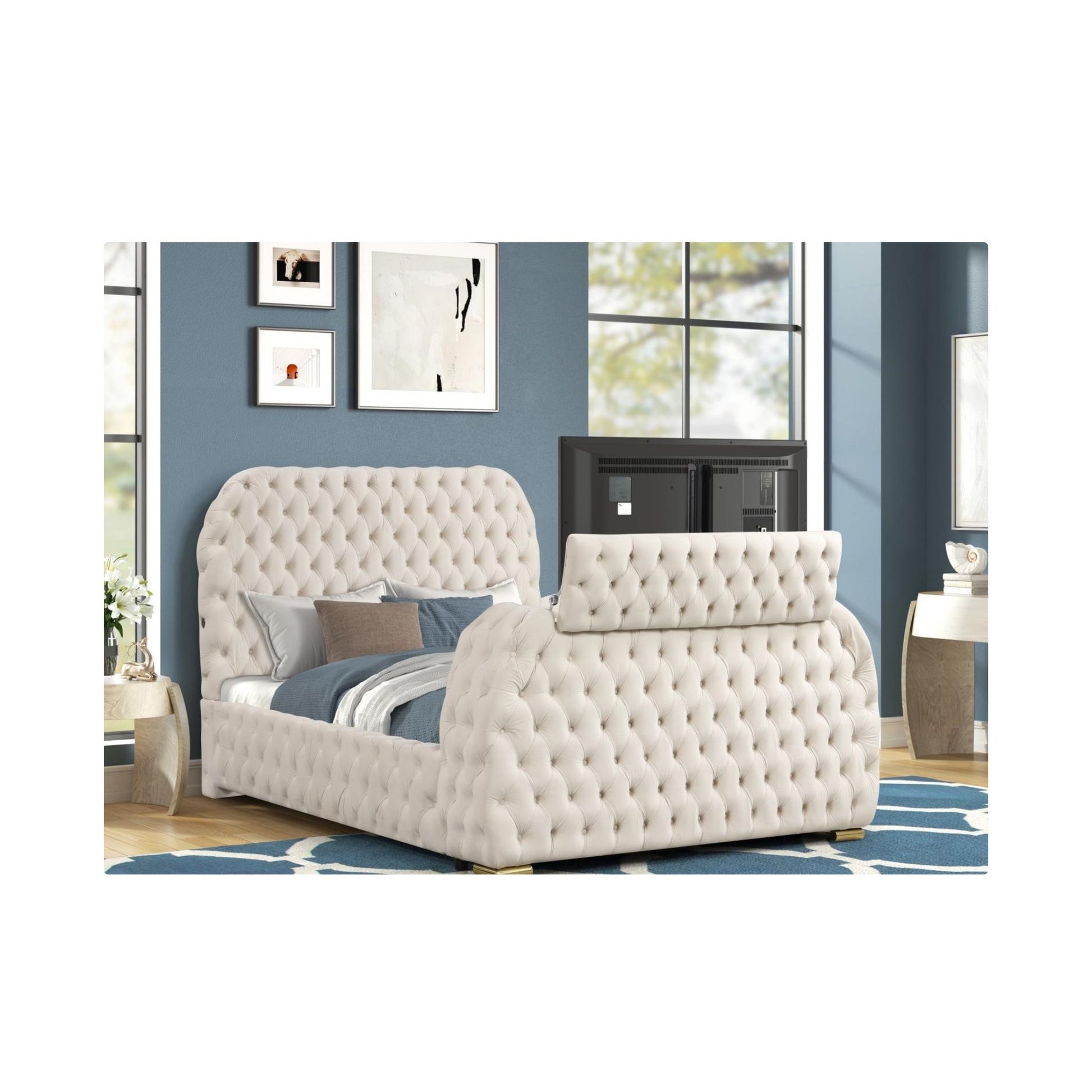 B142-Q-Bed | Rose - Cream Upholstered Queen Bed with TV Lift, Bluetooth speaker and USB Type C |